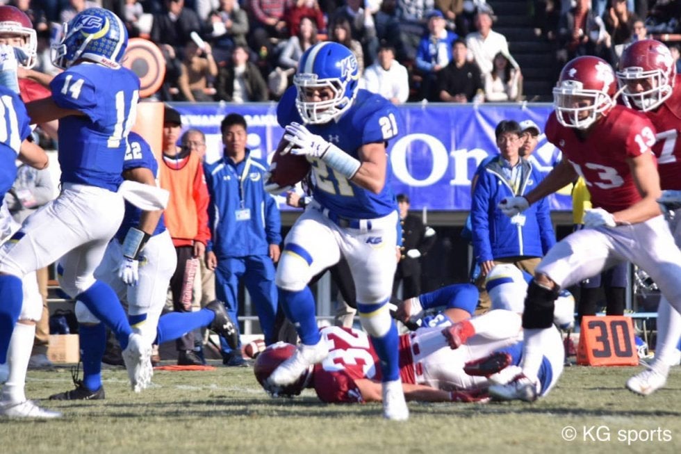 #21RB三宅昴輝(経3)「勝てて本当に良かった。自分がボールを持ったら絶対にTDにつなげようと臨んだので、独走できてうれしかった。試合前は緊張していたが、短い間でも同期や先輩とひたむきに練習してきたことが実った結果だと思う。前半はオフェンスがリズムに乗れていたが、後半は流れが悪かったので、甲子園ボウルまでに修正していきたい。次戦は最後の学生相手の戦いになる。きょうの反省を生かして勝ちたい」