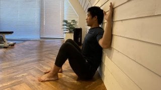 真っすぐな壁の前に膝を立てて座る。お尻は壁からこぶし1個分離れた場所に、背中と後頭部は壁に副うように。両腕をあげ肘と手首、手の甲も壁に付けましょう。