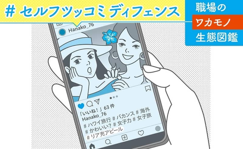 写真は『映える』旅先で撮られた女の子グループのキラキラしたセルフィ。いくつも並べられたハッシュタグの中には「♯リア充アピール」の文字。えっ? 自分でリア充って言っちゃうんだ……と一瞬たじろぎますが、これには理由があるのです。実は、友達から「うわ。リア充アピールしてるよ」と言われないように、先回りして予防線を張っているんです。