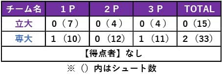試合は専修大のペースで始まった。専修大の技量の高いパスワークに翻弄され、なかなかパックを奪い取ることができない。1P終盤に入りかけた14分38秒、立教サイドのゴール近くで行われたフェイスオフ直後、ライナー性の鋭いシュートが立教を襲い、先制点を奪われた。1セット目を無失点かつ積極的に攻めていくというコンセプトで臨んだ今戦だったが、数少ないチャンスを生かすことができず、1セット目は無得点に終わった。