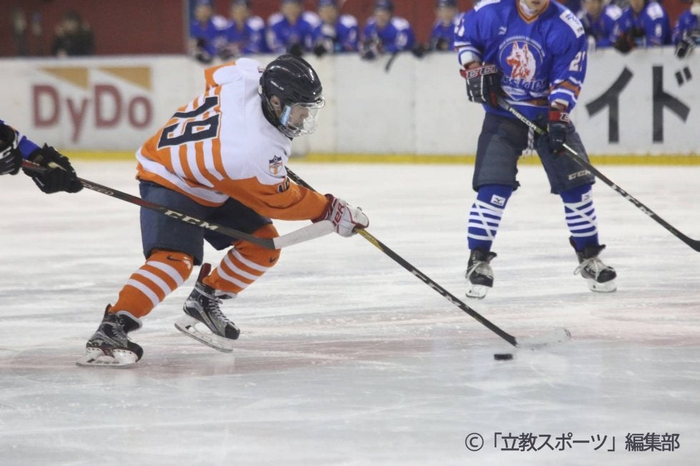 2P開始直後、パックを掴むことに成功し、待望の点を狙う立大だったが相手の勢いはまだまだ健在だった。高い技量で立大のパスワークから素早くパックを奪い取ると、逆に立大サイドのゴールを攻め立てる。序盤、鈴木がペナルティを受け、キルプレーに入ると相手の勢いはさらに増すことになった。キルプレー中の2P5分、東海大のディフェンスが左サイドを抜け出し鋭いシュートを打つ。キーパーの川上が飛びつき、体を張った全力のプレーで好セーブ。スケートリンクで歓声が沸き起こる。この流れで2Pを無失点に抑えたかった立大だったが、2P残り3分、さらに追加点を決められ-0-3となった。