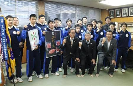 佐藤優大主将は「山形のおいしいコメと肉をありがとうございます。これを自分たちの力にかえ、全国大会では一つでも多く勝てるよう頑張ってきたいと思います」とお礼を述べた。