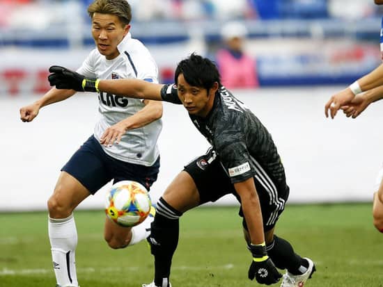 永井謙佑(左)の突破を阻止する朴一圭