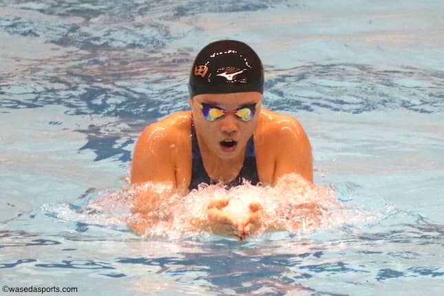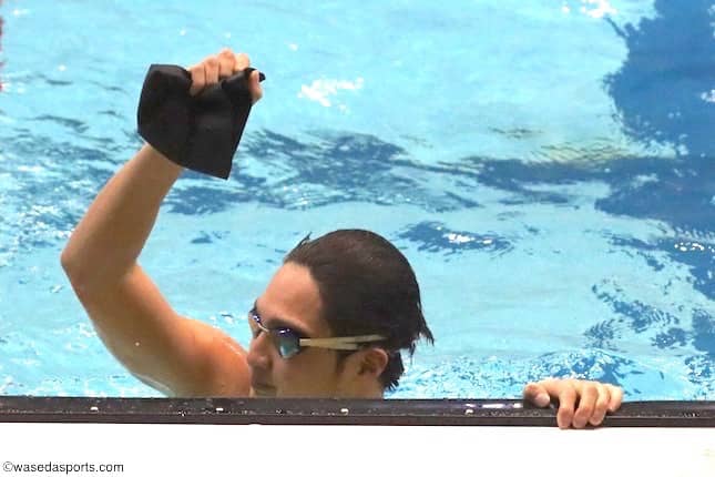 早大の層が厚い男子平泳ぎ勢の活躍が光った。男子100メートル平泳ぎで大﨑威久馬(スポ2=神奈川・桐光学園)が、同200メートルで白石崇大(スポ1=広島・沼田)が新たに日本選手権への出場権を獲得。既に2種目で出場を決めていた平河楓(スポ1=福岡・筑陽学園)を含め、3人が出場種目全てで自己ベストを更新した。「切磋琢磨(せっさたくま)して冬の強化期間を頑張っていきたい」と今井流星主将(スポ3=愛知・豊川)が話すように、互いに高め合い記録を伸ばしていってほしい。また、スプリントチームの面々も躍動。中でも今野太介(スポ1=山形・羽黒)は、男子50メートル自由形と同100メートルでベストタイムを残し、両種目で日本選手権への切符を見事つかんだ。また、峯野友輔(スポ1=大阪・関大北陽)は男子100メートルバタフライで自己ベストを1秒ほど更新する、53秒43をマークした。