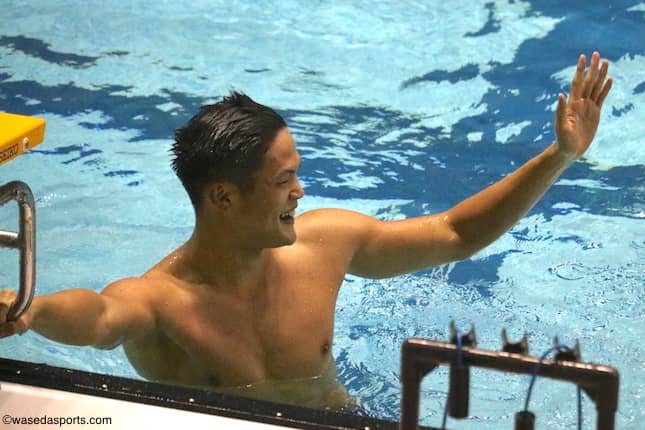 この日、最後の個人種目となった200メートル個人メドレーでも、早大応援席が大いに沸いた。女子では入学後苦しんできた佐々木杏奈(スポ1=神奈川・日大藤沢)が、日本選手権の参加標準記録を1秒以上上回る、2分12秒03を記録。レース後は安堵(あんど)の表情を浮かべた。そして、続く男子では髙野大祐(教2=東京・立教池袋)が魅する。最後の自由形で前方の選手を3人かわし、3位でフィニッシュ。電光掲示板に表示されたのは『1.58.25』。その瞬間初の日本選手権への出場が決まり、大きなガッツポーズが飛び出した。