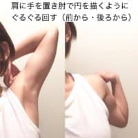 ② 肩に手を置き肘で円を描くように前回しでぐるぐる回す。(後ろ回しも同様に)