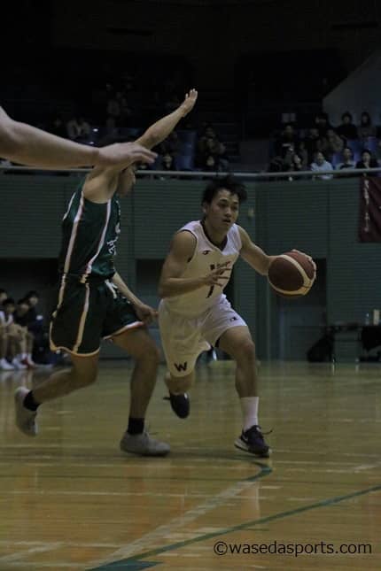 基本的には下がってくるディフェンスで、最初は何かわからない変則的なゾーンをやっていたのですが、フォーアウトでドライブというのを何回も繰り返して、何回も作って、最後強く中でフィニッシュするというように、簡単にスリーポイントは打たずに、ドライブとキックアウトをしてスリーポイントを決めようとしていました。それが早稲田のセット以前のベースのオフェンスなので、そこのベースを貫こうという形でやっていました。マンツーマンに変わった時はピックアンドロールが僕たちは増えるのでそれに対して相手がどのように守っているのかというのを見定めてやろうというふうに試合前は話していたのですが、そこをなかなかアジャストできずに3ピリで相手のディフェンスにやられてしまって、ターンオーバーだったり上手く攻めれなかったりということがあったので、そこは一度ピックのディフェンスで決まった守り方をされたら、全員で共有して、同じ手には乗らないようにしたいなと思います。