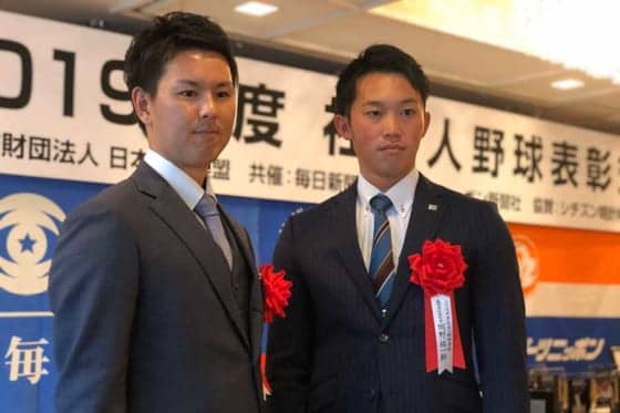 「2019年度社会人野球表彰式」に出席したJFE東日本・須田幸太(左)と東芝・岡野祐一郎【写真:安藤かなみ】