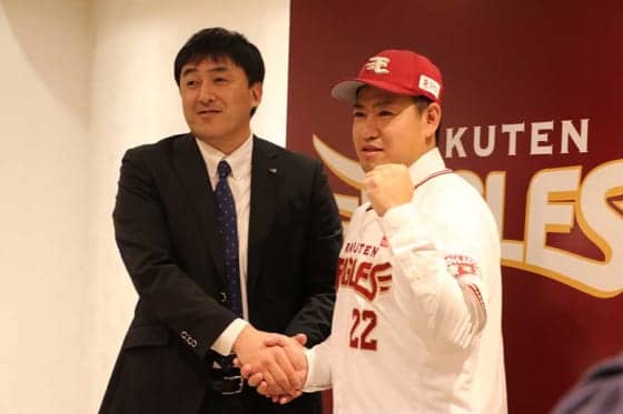 楽天の入団会見に臨んだ牧田和久(右)と石井一久GM【写真:編集部】