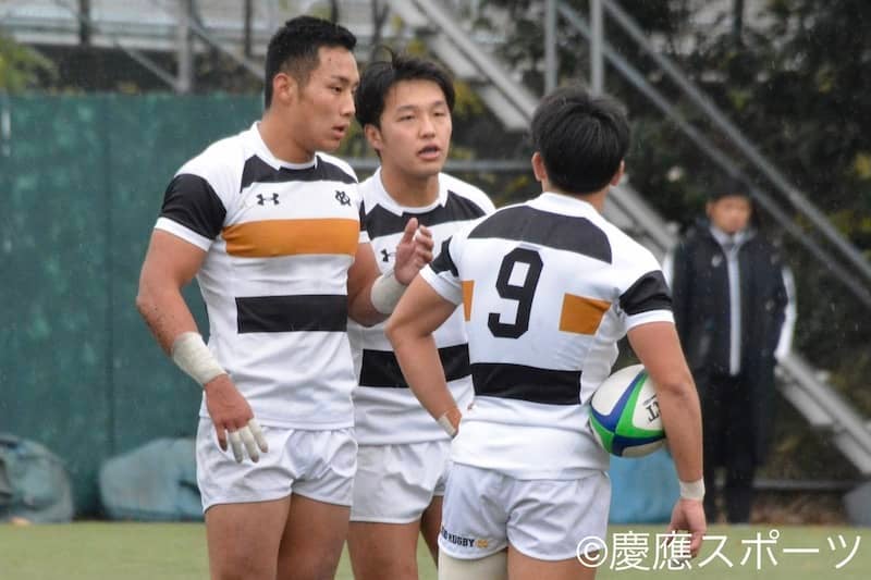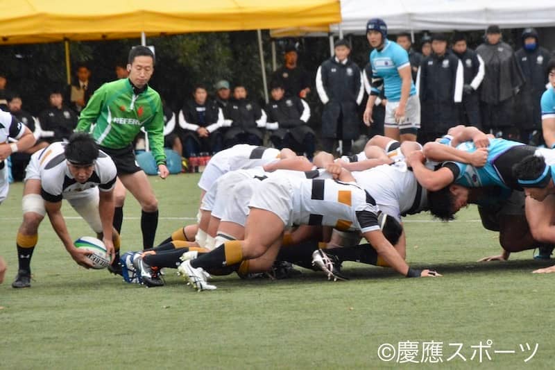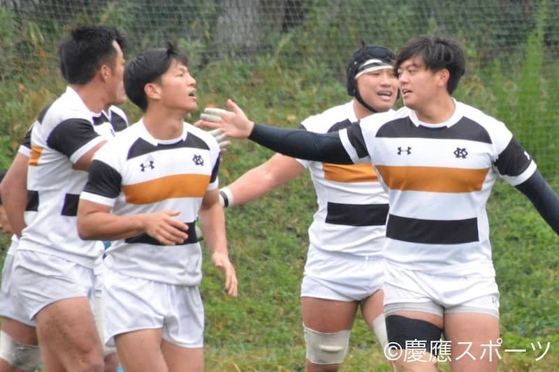 その後は攻守に慶大が圧倒する。反撃に出る筑波大の攻撃に対しては「ライズ」と「指指しノミネート」を徹底。攻撃面では、それまで押され気味だった接点で前に出て、筑波大のペナルティを誘発。ペナルティからの敵陣侵入、そこからのラインアウトモールでさらに2つのトライを追加した。加えて、キックを多用する攻撃が機能し、辻田がこの試合3本目となるトライを挙げて勝負あり。試合終了間際に許したトライ1本のみで抑え、41-5の快勝を飾った。
