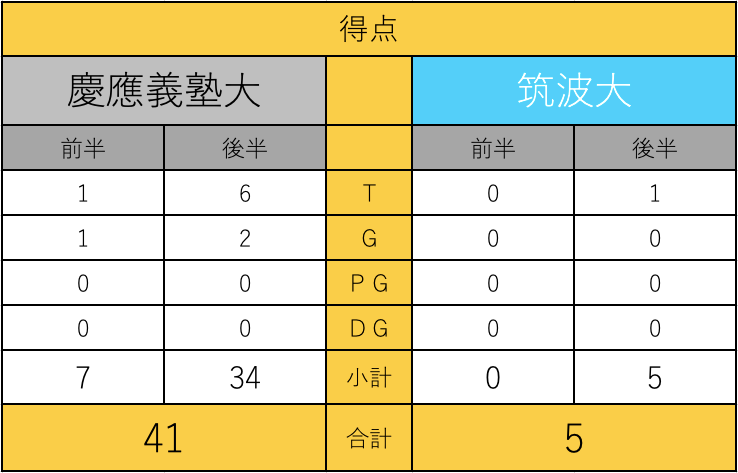 この後は両チーム粘りのディフェンスで得点を許さない。特に筑波大は強固なディフェンスラインを敷き、幾度となくハーフウェイ付近で慶大を押し返した。対する慶大も攻撃に変化が生まれ始める。試合が進むにつれ、キックを織り交ぜながらの攻撃が目立つようになった。