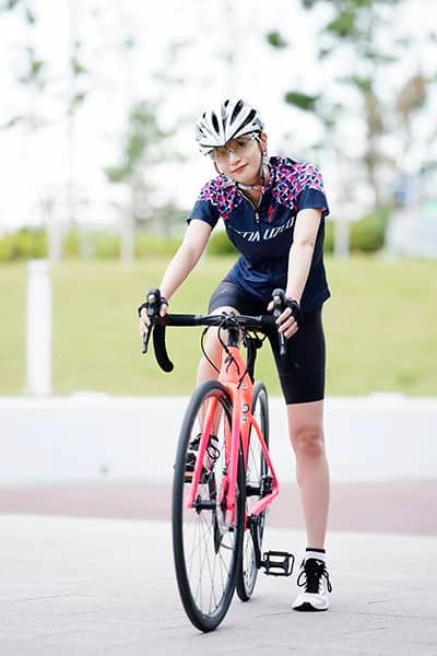 シューズ:ウエーブライダー22(ミズノ) 自転車:TARMAC DISC EXPERT/トップス:SL PRO JERSEY SS WMN/バイクウェア パンツ:SL R BIB SHORT WMN/グローブ:BODY GEOMETRY GRAIL GLOVE(以上、Specialized