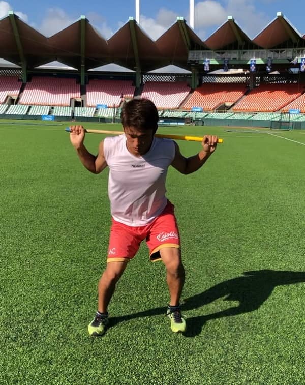 ①スティック(棒)を写真のように持ち、片足でパワーポジションを作ります。