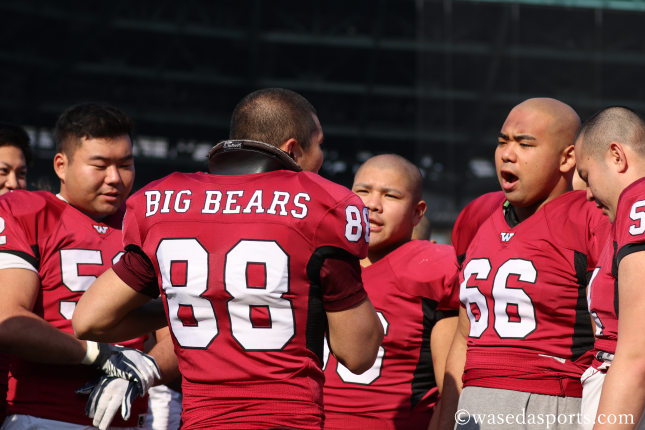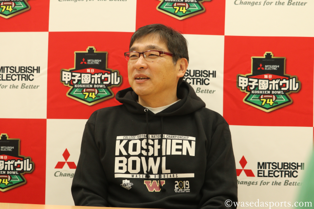 記者会見を行なったのは、高岡勝監督(平4人卒=静岡聖光学院)、LB池田直人主将(法4=東京・早大学院)、DL二村康介副将(文構4=東京・獨協)、QB柴崎哲平副将(政経4=東京・早大学院)、K/P髙坂將太(創理3=東京・国立)、WRブレナン翼(国教4=米国・ユニバーシティラボラトリースクール)の6名。高岡監督はあすの試合について「先行逃げ切り」のゲームプランで挑むと宣言。「関学大のファーストシリーズをスリーアンドアウトに抑えられるかが鍵になってくる」と語った。また、池田主将も「関学大学さんには何度も負けてきたので、ここでしっかり勝って終わるのが目標」と、あすの一戦へ向けた意気込みを口にした。