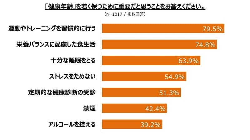 また、「健康年齢」を若く保つために重要だと思うことは、「運動やトレーニングを習慣的に行う(79.5%)」が最も多く、身体を動かすことが大切だという考えが強いようです。[グラフ②]