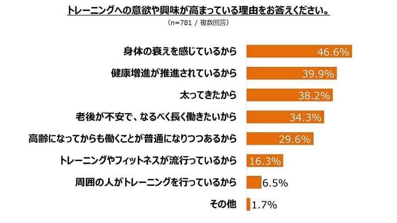 実際に、以前よりもトレーニングへの意欲や興味が高まっていると答えた人は6割以上で [グラフ③]、その理由は、「身体の衰えを感じているから(46.6%)」が最も多く、次いで「健康増進が推進されているから(39.9%)」、「太ってきたから(38.2%)」、「老後が不安で、なるべく長く働きたいから(34.3%)」といったように、「身体」と「社会環境」における変化が、トレーニングへの意欲を高める要因となっているようです。[グラフ④]