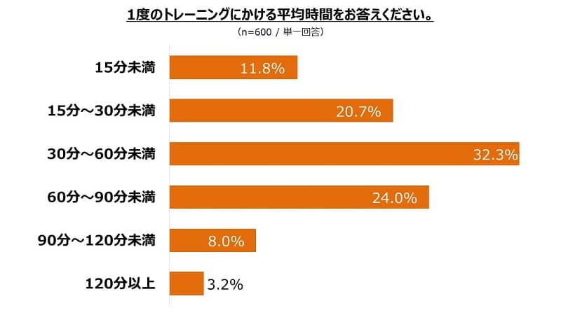 それでは、実際のトレーニングの状況はどうでしょうか。1度のトレーニングに費やす平均時間は「30分~60分未満(32.3%)」が最も多く、約9割が90分未満でトレーニングしています。[グラフ⑤]