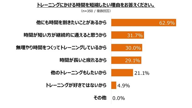 また、58.3%がトレーニングの時間をもっと短くしたいと考えていることが分かりました。その理由は、「他にも時間を割きたいことがあるから(62.9%)」が断トツで多く、「時間が短い方が継続的に通えると思うから」「無理やり時間をつくってトレーニングしているから」といった理由も目立ちました。[グラフ⑥]