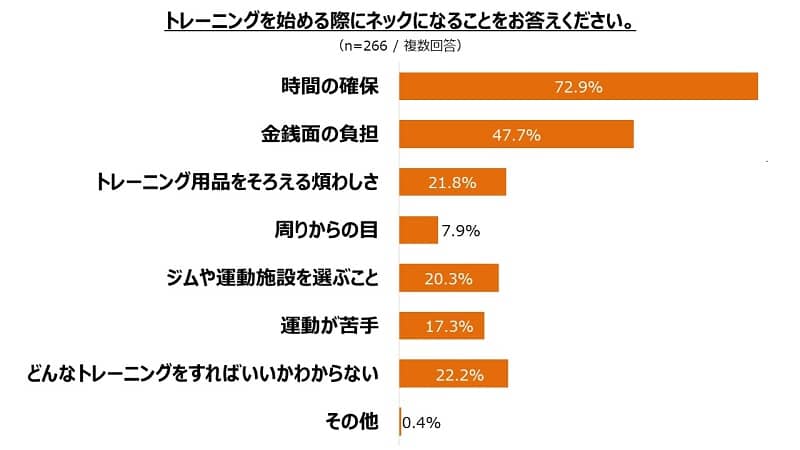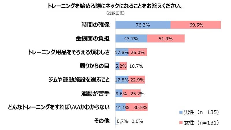 また、女性で「周りからの目」「運動が苦手」「どんなトレーニングをすればいいかわからない」と答えた割合が男性の2倍となり、女性におけるトレーニングの習慣化には、時間の確保以外にも様々な障壁があることがわかりました。[グラフ⑧]