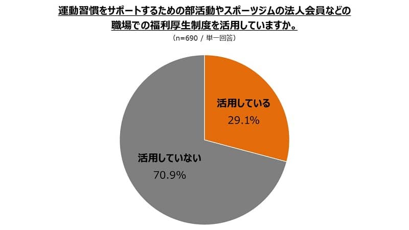 従業員の運動・トレーニングを支援する福利厚生制度もたびたび話題になっていますが、企業の思いとは裏腹な実態も明らかになりました。職場での運動習慣をサポートするための部活動やスポーツジムの法人会員などの福利厚生制度について聞いたところ、制度があると答えた人は約6割にとどまり、さらにそのうちの約7割が制度を活用していないことが判明。[グラフ⑨]