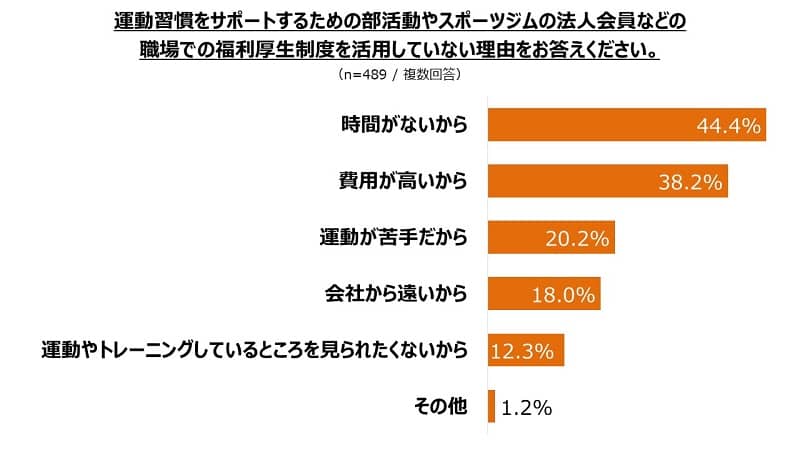その理由は、「時間がないから(44.4%)」が最も多く、次いで「費用が高いから(38.2%)」、「運動が苦手だから(20.2%)」となりました。[グラフ⑩]