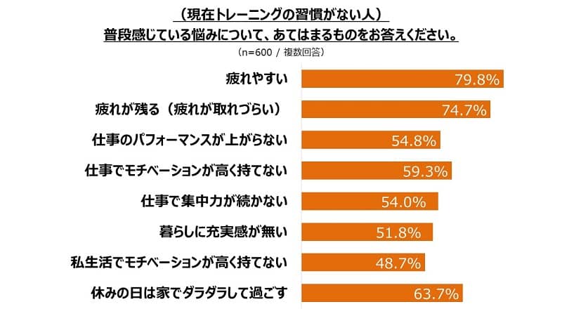 それでは、トレーニングの有無は私たちにどのような影響を与えているのでしょうか。現在トレーニングの習慣がない600人に普段感じている悩みを聞いたところ、7割以上が「疲れやすい」「疲れが残る」と回答。また、「仕事でモチベーションが高く持てない」「仕事のパフォーマンスが上がらない」「仕事で集中力が続かない」と仕事での不調を感じている人が過半数となりました。さらに約半数が「私生活でモチベーションが高く持てない」「暮らしに充実感が無い」と私生活での悩みも感じています。[グラフ⑪]