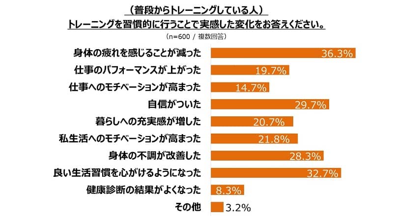 一方で、普段からトレーニングしている人600人にトレーニングを習慣化したことで感じた変化を聞いたところ、最も多い36.3%が「身体の疲れを感じることが減った」と答えました。また、トレーニング習慣がない人の多くが悩んでいる仕事での不調については、19.7%が「仕事のパフォーマンスが上がった」、14.7%が「仕事へのモチベーションが高まった」と仕事でのポジティブな変化を感じており、「私生活へのモチベーションが高まった(21.8%)」、「暮らしへの充実感が増した(20.7%)」など私生活への好影響も多く見受けられます。