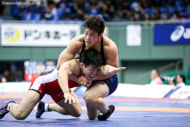 敗者復活1回戦から臨んだ吉村は2回戦まで相手を無失点で抑え危なげなく勝ち進んだが、3位決定戦ではインカレ決勝で立ちはだかった早山竜太郎(拓大)相手に攻撃に転じられず敗退。「いまひとつ決め手がなかったかな」と振り返ったようにテクニカルポイントを獲得することができず、昨年の天皇杯と同様5位入賞という結果に終わった。結果について「微妙」と答えた吉村。学生最後の全日本で表彰台にのぼることは叶わなかった。敗者復活戦1回戦をテクニカルフォールの圧勝で突破した米澤は3位決定戦に臨んだ。中村剛士(国士舘大)との3位決定戦は死闘となった。1点差で折り返すと、相手がとれば米澤もとりかえし一歩も譲らない展開が続く。しかし、試合終了30秒前相手の右足に食らいついた米澤がタックルに成功し2点のリードをとる。集中力を切らさずそのリードを守りきり勝利。死闘を制し3位入賞を決めた。ビハインドの状態で追いかける展開となったが、米澤は「焦らなかった」と試合後語った。敗者復活戦1回戦から臨んだ鈴木は東日本学生秋季選手権優勝者に敗北。テクニカルポイントを獲得できず悔しい敗戦となった。