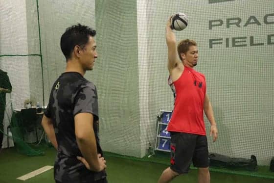 「腕が下がる原因で考えられることは、長いシーズンを投げ続けることによって、ボールを投げる上でとても影響力のある肩甲骨周りの筋肉の機能が低下することによって起こること」と木村トレーナーは考案し、トレーニングは進められた。手のひらより少し大きく、素材はバスケットボールに似ていて滑らず指に良くかかるボールを使用。肩甲骨周りの筋肉を使いながら、頭の上からバウンドさせつつこのボールを投げることで、実際に球を投げる時に必要な「しなり」と「腕の高さ」を調整できるようになる。