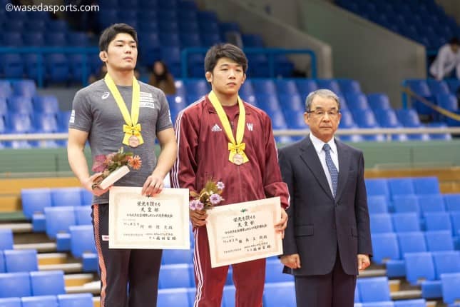 今年学生最後である岩澤と宇井。岩澤は初戦をきっちり勝利したが、準々決勝の第2Pで失点を重ねテクニカルフォール負けに喫した。「あまり自分のかたちに持っていけなかった。悔しいです」と試合後語った。宇井は第1Pで得意のパッシブからの投げ技を決め点差を離したものの、第2Pで相手に投げを2度決められてしまい9ー9のビックポイント差負け。「バテちゃいました」と省みた宇井。表彰台にのぼることが目標と言っていただけに無念の敗退となった。決勝に臨んだ小玉は先にパッシブを2度献上してしまいなかなか得点できない時間が続いたが、残り1分半で相手の右足を狙いテークダウンを決め優勢に。このままいけば優勝、耐える時間が続いたが残り10秒で相手にバックをとられ逆転。悲願の全日本優勝を成し遂げることはできなかった。小玉は予選の右腕の怪我によって本来のパフォーマンスをすることはできなかったが、全日本優勝への気持ちを強く語っておりその悔しさは計り知れるものではなかった。
