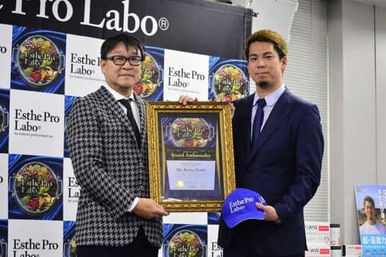 ブランドアンバサダー就任記者会見に登壇したドジャース・前田健太(右)【写真:編集部】