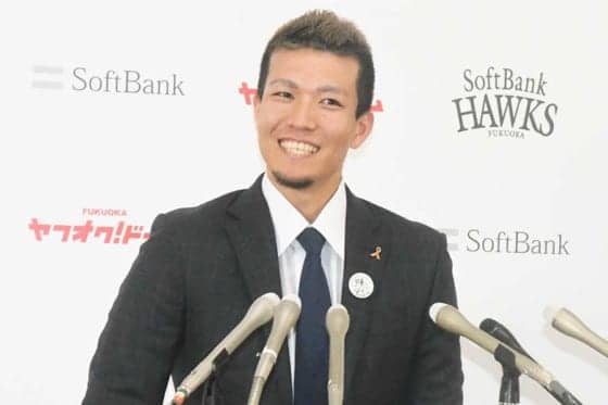 鷹・千賀、会見であえて胸に付けた“謎のバッジ”の正体は… 「大好きな先輩だから」