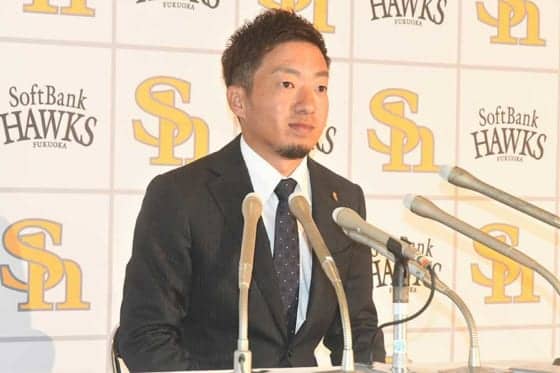鷹・千賀、会見であえて胸に付けた“謎のバッジ”の正体は… 「大好きな先輩だから」
