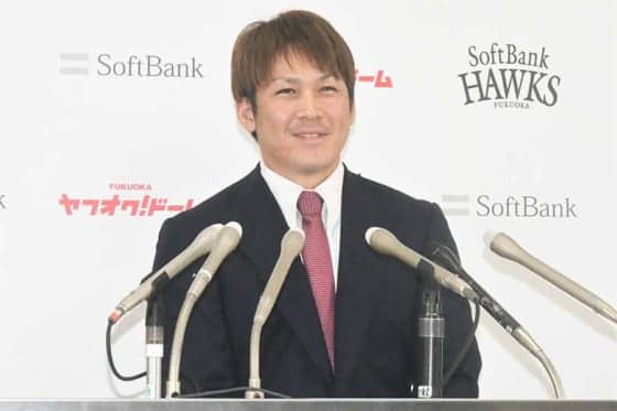 鷹・千賀、会見であえて胸に付けた“謎のバッジ”の正体は… 「大好きな先輩だから」