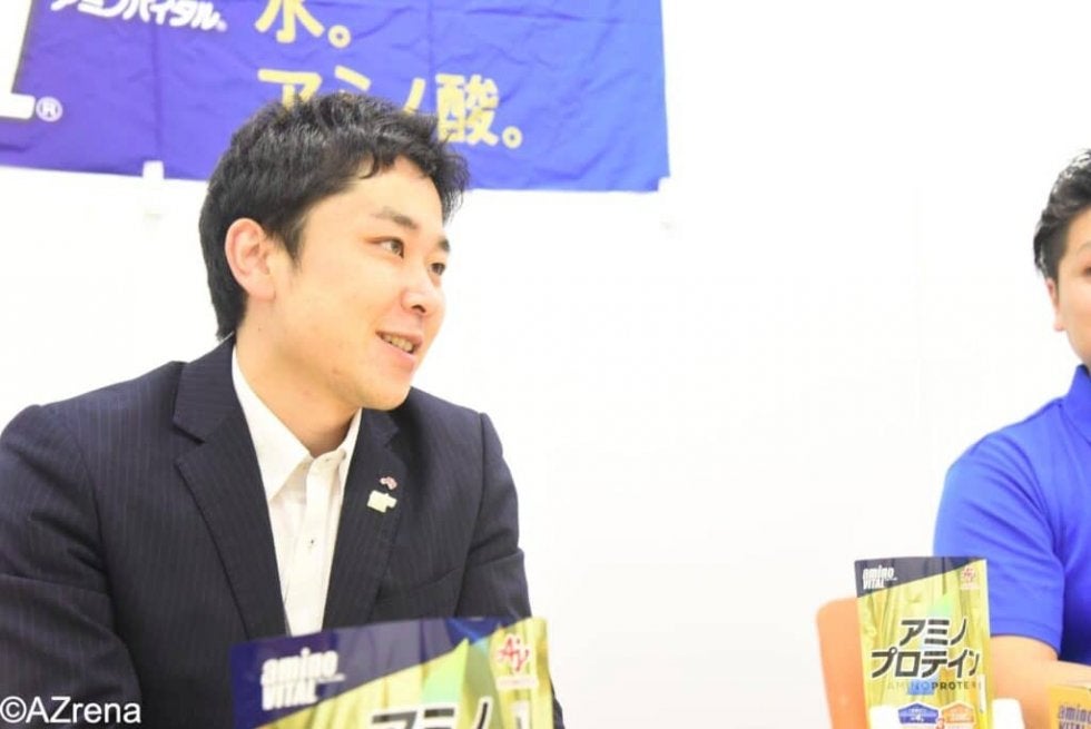 今なお進化を続けるアミノバイタルの知られざる奥深さと、製品開発を行う味の素が持つアミノ酸へのこだわりとは。アミノサイエンス事業本部・スポーツニュートリション部の長田智大さんと日置和宏さんにお話を伺いました。