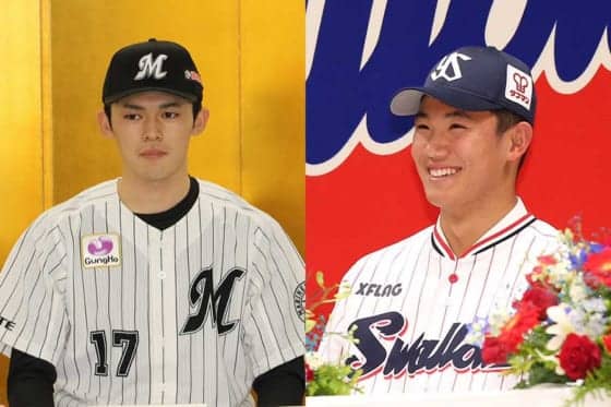 ロッテに入団する佐々木朗希、ヤクルトに入団する奥川恭伸(左から)【写真:編集部、小倉元司】
