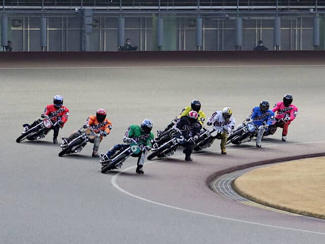 ここもスタート決めた6・佐藤摩が2番手につけ、8・鈴木と4・佐藤貴が機を狙う。