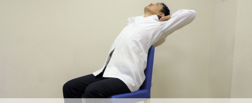1.椅子に浅く腰掛け、足を軽く開きます。2.両腕を頭の後ろで組み、背中を後方へ引き伸ばして胸を開きましょう。