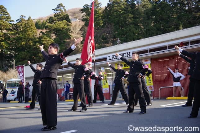 応援部員がバスに乗って移動した先は往路ゴール、第5区の応援場所であるローソン元箱根店前。コンビニの駐車場という場所の特性を活かして横に広く展開し、沿道で応援する人々を振り向かせた。ここで5区の選手を待ちながら応援曲が次々と披露される。しかし、往路の先頭を走る選手が応援場所の前を通過してからは、観客の視線が徐々に道路の方へと引き寄せられていくが、迫力のある学注やユーモアを取り入れた豆知識紹介企画で注目を取り戻す。駅伝の応援では「選手に対して『覇者、覇者、早稲田』という一番力になる箇所を聴かせるというのが目標」と石島航輔吹奏楽団責任者(教3=東京・都市大等々力)が語るように1秒単位で選手が来るタイミングを計算し、その一瞬に全力をかけて『紺碧の空』を披露する。しかしこの5区で、沿道の人やのぼりの多さや連絡の取りづらさから、曲を流すタイミングが遅くなってしまい、駅伝応援の難しさを痛感した。最後は主将による校歌で初日の応援を締めくくり、反省点も抱えつつ、復路の応援に臨んだ。