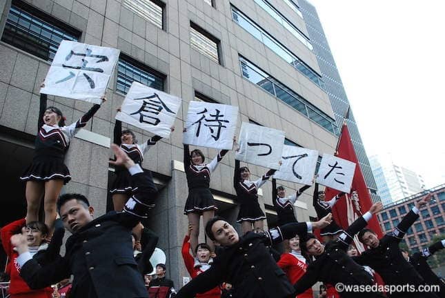 1時間前から応援を始めていて、『紺碧の空』がいちばん良いタイミングで流れるように新3年生中心にどの部分を切るか、どの企画を追加するかなどをやっており、最初は選手が走ってくる方向に向けて「宍倉待ってた」を持ちますが、選手が通り過ぎるタイミングで選手のいる向きに変えています。そうするにあたっても、『紺碧の空』をどのタイミングでやるかが必要になってきて、テレビを見ている人員がいたり、ちょっと離れたところで早稲田の選手のみならず前の学校の選手が通り過ぎたら連絡をしたり、何分何秒あいてるから何分後には選手が通り過ぎるかを計算して『紺碧の空』に変えたりしているので、かなりハラハラドキドキします。それまでは盛り上がるコンバットマーチなどでつないで、最後の最後、そろそろくるぞというときに『紺碧の空』で向き変えをやります。人が多くて選手が見えづらく、応援部員も選手が見えないときもありますが、沿道のそばにいる部員と連携を取って向き変えをしています。