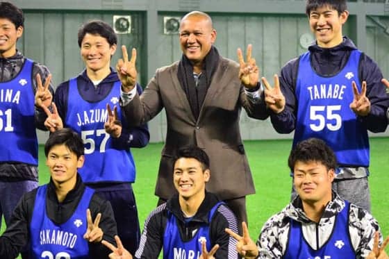 雨模様のため室内練習場で迎えた初日。ラミレス監督は7人の前に現れると「今日の調子はどうですか?サムイ?」と緊張をほぐすように笑顔で話しかけた。