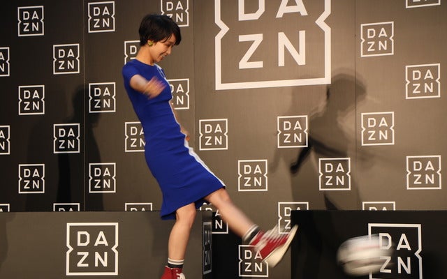 スポーツのライブストリーミングサービス「DAZN(ダ・ゾーン)」のパブリックビューイングトラック出発式(東京・六本木)に、剛力彩芽さんらが登場。ステージ上で見事なトーキックシュートを見せ、憧れの男性像について語った。