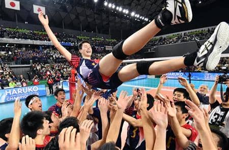 優勝し、胴上げされる東山・高橋藍=12日、武蔵野の森総合スポーツプラザ(鴨川一也撮影)