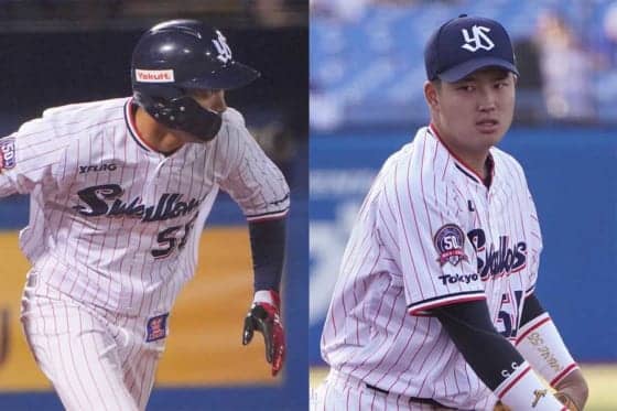 ヤクルト・上田剛史(左)と村上宗隆【写真:荒川祐史】