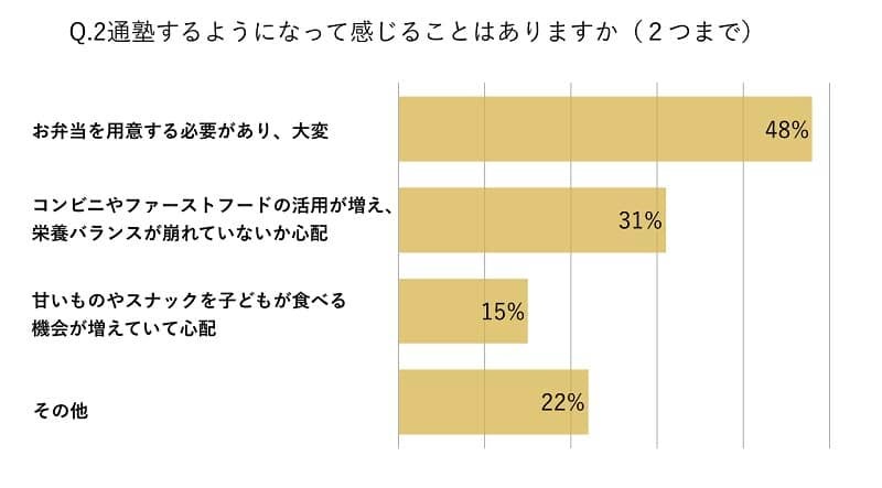 通塾に際しては、「お弁当を用意する必要があり、大変」という親御さんが48%と、お弁当作りに負担を感じていること。「手作り弁当を持たせていても、冷凍食品に頼って同じようなメニューになってしまう」や「栄養バランスが大事だとわかりながらも、時間の余裕がない」「冷めても美味しいもの、飽きのこないものを選ぶのが大変」といった悩みを挙げていらっしゃるケースが目立ちました。