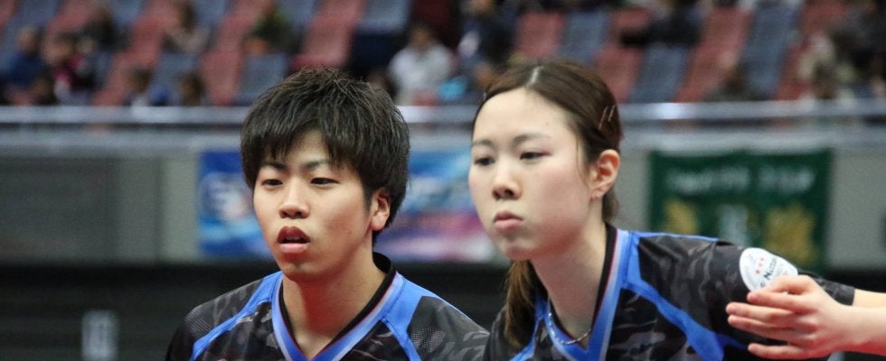 14日、全日本選手権(以下、全日本)混合ダブルス準々決勝が行われ、硴塚将人(早稲田大)/森田彩音(中央大)が、2連覇中の森薗政崇(BOBSON)/伊藤美誠(スターツ)ペアを追い詰めるもゲームカウント2-3で惜敗した。