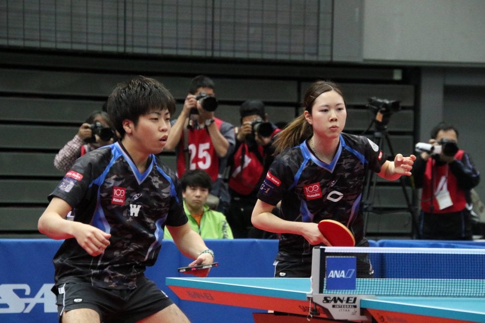 写真:逆転勝利した森薗政崇(BOBSON)・伊藤美誠(スターツ)/撮影:ラリーズ編集部