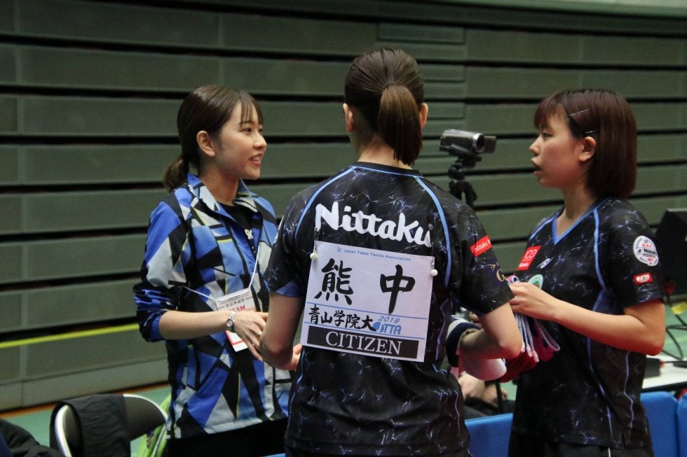 ベンチコーチとして入ったのは石川佳純(全農)の妹でもあり、青山学院大女子卓球部の前主将・石川梨良だ。「安心感がすごくある的確なアドバイス。声もしっかり出して応援もしてもらったので、もっと頑張らないと、という気にもなりました」と前主将・石川のアドバイスに感謝を述べた。