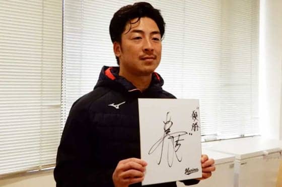 色紙に今シーズンの抱負をしたためたロッテ・美馬学【写真:編集部】