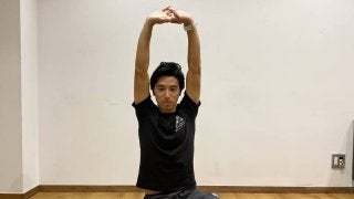 手を組んで、両腕を真上にあげ、背中をのばします。